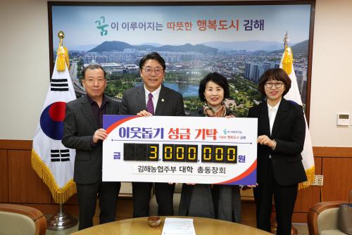 [½Åµ¿¾Æ¹æ¼Û´º½º=±èÁÖ¿¬±âÀÚ] ±èÇØ½Ã(½ÃÀå ȫſë)´Â 22ÀÏ ±èÇØ³óÇùÁֺδëÇÐ Ãѵ¿Ã¢È¸(´ëÇ¥ ¼º¸í¼÷)¿¡¼­ ÀÌ¿ôµ½±â ¼º±Ý 300¸¸¿øÀ» ±âŹÇß´Ù°í ¹àÇû´Ù. ¼º±ÝÀº ÃÊ·Ï¿ì»ê¾î¸°ÀÌÀç´ÜÀ» ÅëÇØ ¾Æµ¿º¹Áö½Ã¼³ ¾î¸°À̵鿡°Ô Áö¿øµÈ´Ù. ±èÇØ³óÇùÁֺδëÇÐ Ãѵ¿Ã¢È¸´Â 2021³â¡¦