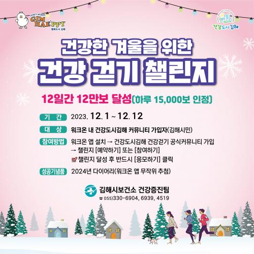 [½Åµ¿¾Æ¹æ¼Û´º½º=±èÁÖ¿¬±âÀÚ] ±èÇØ½Ãº¸°Ç¼Ò´Â 12¿ù 1ÀϺÎÅÍ 12ÀϱîÁö 12Àϰ£ °Ç°­ÇÑ °Ü¿ï³ª±â¸¦ À§ÇÑ °Ç°­ °È±â 縰Áö¸¦ ½Ç½ÃÇÑ´Ù°í ¹àÇû´Ù. À̹ø 縰Áö´Â ½Åü Ȱµ¿ÀÌ ºÎÁ·Çϱ⠽¬¿î °Ü¿ïöÀ» ¸ÂÀÌÇÏ¿© ½Ã¹ÎµéÀÌ Àϻ󿡼­ °Ç°­ °È±â¸¦ ½º½º·Î ½ÇõÇÏ¿© 12Àϰ£ 1¡¦