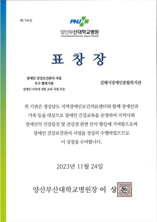 [½Åµ¿¾Æ¹æ¼Û´º½º=±èÁÖ¿¬±âÀÚ] (Àç)±èÇØ½Ãº¹ÁöÀç´Ü(´ëÇ¥ÀÌ»ç ÃÖÁ¤±Ô)¿¡¼­ ¿î¿µ ÁßÀÎ ±èÇØ½ÃÀå¾ÖÀÎÁ¾ÇÕº¹Áö°ü(°üÀå ¿©¹ÌÁø)Àº ÀÌ´Þ 24ÀÏ °æ»ó³²µµ Áö¿ªÀå¾ÖÀκ¸°ÇÀÇ·á¼¾ÅÍ(¼¾ÅÍÀå ½Å¿ëÀÏ)¿¡¼­ ÁÖ°üÇÏ´Â ¡®Àå¾ÖÀÎ °Ç°­º¸°Ç°ü¸® »ç¾÷ ¿ì¼ö Çù·Â±â°ü ǥâÀ塯À» ¼ö»óÇß´Ù. ¡¦