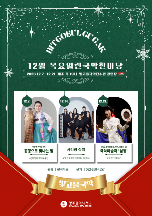 [½Åµ¿¾Æ¹æ¼Û=ÀÌÁöÇö±âÀÚ] ±¤ÁÖ±¤¿ª½Ã ¼­±¸(±¸Ã»Àå ±èÀ̰­)´Â ¿¬¸»À» ¸Â¾Æ 7ÀϺÎÅÍ 21ÀϱîÁö ¸ÅÁÖ ¸ñ¿äÀÏ ¿ÀÈÄ 7½Ã ºû°íÀ»±¹¾ÇÀü¼ö°ü °ø¿¬Àå¿¡¼­ ¡®12¿ù ¸ñ¿ä¿­¸°±¹¾ÇÇѸ¶´ç¡¯À» °³ÃÖÇÑ´Ù. 7ÀÏ Ã¹ °ø¿¬Àº ±¤ÁÖ±¤¿ª½Ã ¹«Çü¹®È­Àç °¡¾ß±Ýº´Ã¢ º¸À¯ÀÚ ÀÌ¿µ¾Ö ¸íÀÎÀÌ À̲ô¡¦