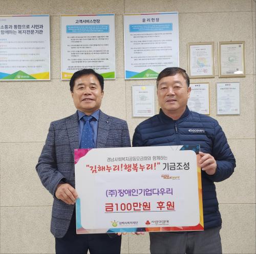 [½Åµ¿¾Æ¹æ¼Û´º½º=ÃÖ¼ÛÈ­±âÀÚ] ¡Û Àå¾ÖÀαâ¾÷´Ù¿ì¸® ÁÖ½Äȸ»ç(´ëÇ¥ ±Ç¿ìÇö)´Â 12¿ù 12ÀÏ(È­), (Àç)±èÇØ½Ãº¹ÁöÀç´Ü(´ëÇ¥ÀÌ»ç ÃÖÁ¤±Ô)¿¡ ¿¬¸»¿¬½Ã¸¦ ¸Â¾Æ Áö¿ªÀÇ ¾î·Á¿î ÀÌ¿ôÀ» À§ÇØ »ç¿ëÇØ ´Þ¶ó¸ç ÈÄ¿ø±Ý 100¸¸¿øÀ» Àü´ÞÇß´Ù. ¡Û À۳⿡ À̾î À̳¯ Àü´ÞµÈ ÈÄ¿ø±Ý 100¸¸¡¦