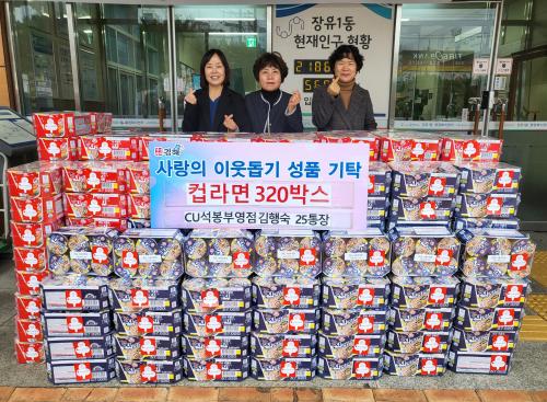 [½Åµ¿¾Æ¹æ¼Û´º½º=ÃÖ¼ÛÈ­±âÀÚ] ÀåÀ¯1µ¿ÇàÁ¤º¹Áö¼¾ÅÍ´Â 11ÀÏ CUÀåÀ¯¼®ºÀºÎ¿µÁ¡¿¡¼­ ¾î·Á¿î ÀÌ¿ôÀ» À§ÇØ ÄŶó¸é 320¹Ú½º(200¸¸¿ø »ó´ç)¸¦ ±âŹÇß´Ù°í ¹àÇû´Ù. CUÀåÀ¯¼®ºÀºÎ¿µÁ¡À» ¿î¿µÇϰí ÀÖ´Â ±èÇà¼÷ ÅëÀåÀº ¸Å¿ù ù°, ¼Â° ÁÖ ±Ý¿äÀÏ¿¡ ÆíÀÇÁ¡ µµ½Ã¶ô ³ª´®À» ½ÇõÇÏ¡¦