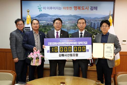 [½Åµ¿¾Æ¹æ¼Û´º½º=ÃÖ¼ÛÈ­±âÀÚ] ±èÇØ½Ã¹Ì·¡ÀÎÀçÀåÇÐÀç´Ü(ÀÌ»çÀå ÇöÁ¾¿ø)Àº 13ÀÏ ±èÇØ½Ã»ê¸²Á¶ÇÕ(Á¶ÇÕÀå ¼­È¯¾ï)¿¡¼­ ÀåÇбâ±Ý 1,000¸¸¿øÀ» ±âŹÇß´Ù°í ¹àÇû´Ù. Á¶ÇÕÀº Áö³­ 2019³âºÎÅÍ ¸Å³â 1,000¸¸¿ø¾¿ ±âŹÀ» À̾î¿Í ´©Àû±â±ÝÀÌ 5,000¸¸¿ø¿¡ À̸¥´Ù. Á¶ÇÕÀº Áö¿ªÀÇ¡¦