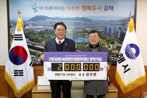 [½Åµ¿¾Æ¹æ¼Û´º½º=ÃÖ¼ÛÈ­±âÀÚ] ±èÇØ½Ã¹Ì·¡ÀÎÀçÀåÇÐÀç´Ü(ÀÌ»çÀå ÇöÁ¾¿ø)Àº 20ÀÏ ±èÇØ½Ã ¿Üµ¿¿¡ ÀÖ´Â Àå¾ÖÀαâ¾÷´Ù¿ì¸®¢ß(´ëÇ¥ ±Ç¿ìÇö)¿¡¼­ ÀåÇбâ±Ý 200¸¸¿øÀ» ±âŹÇß´Ù°í ¹àÇû´Ù. ´Ù¿ì¸®´Â Áö³­ 2020³âºÎÅÍ ¸Å³â ±âºÎ¸¦ À̾î¿Í ¿ÃÇØ°¡ 4¹øÂ°ÀÌ´Ù. ´Ù¿ì¸®(ÁÖ)´Â Àå¾Ö¡¦