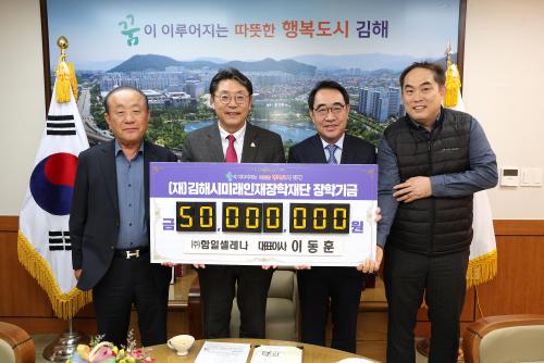 [½Åµ¿¾Æ¹æ¼Û´º½º=ÃÖ¼ÛÈ­±âÀÚ] ±èÇØ½Ã¹Ì·¡ÀÎÀçÀåÇÐÀç´Ü(ÀÌ»çÀå ÇöÁ¾¿ø)Àº 28ÀÏ ¢ßÇÔÀϼ¿·¹³ª(´ëÇ¥ À̵¿ÈÆ)¿¡¼­ Áö³­ÇØ¿¡ ÀÌ¾î ¿ÃÇØµµ ÀåÇбâ±Ý 5,000¸¸¿øÀ» ±âŹÇß´Ù°í ¹àÇû´Ù. ±èÇØ½Ã Áø¿µÀ¾¿¡ À§Ä¡ÇÑ ¢ßÇÔÀϼ¿·¹³ª´Â 1991³â 8¿ù¿¡ ¼³¸³ÇßÀ¸¸ç °ÇÃ๰ÀÇ Ã¢Æ², ¹®Æ² ¡¦