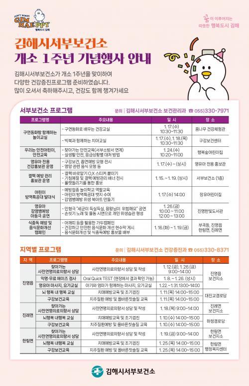 [½Åµ¿¾Æ¹æ¼Û´º½º=±èÁÖ¿¬±âÀÚ] ±èÇØ½Ã ¼­ºÎº¸°Ç¼Ò°¡ °³¼Ò 1ÁÖ³âÀ» ¸ÂÀÌÇÏ¿©, 1¿ù 15ÀϺÎÅÍ 31ÀϱîÁö Áö¿ªÁֹΰú ÇÔ²²ÇÏ´Â ´Ùä·Î¿î ±â³äÇà»ç¸¦ ÁøÇàÇÑ´Ù°í ¹àÇû½À´Ï´Ù. À̹ø 1Áֳ⠱â³äÇà»ç¿¡´Â ¡®¿µÀ¯¾Æ Ưȭº¸°Ç¼Ò¡¯¶ó´Â À̸§¿¡ °É¸Â°Ô ¾î¸°ÀÌ¿Í °¡Á·µéÀ» ´ë»óÀ¸·Î¡¦