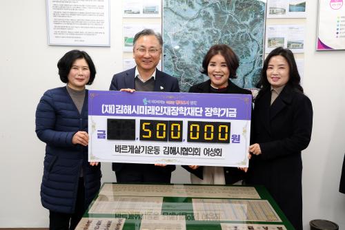 [½Åµ¿¾Æ¹æ¼Û´º½º=±èÁÖ¿¬±âÀÚ] ±èÇØ½Ã¹Ì·¡ÀÎÀçÀåÇÐÀç´Ü(ÀÌ»çÀå ÇöÁ¾¿ø)Àº 3ÀÏ ¹Ù¸£°Ô»ì±â¿îµ¿ ±èÇØ½ÃÇùÀÇȸ ¿©¼ºÈ¸(ȸÀå ¾çÇý·Ã)¿¡¼­ ÀåÇбâ±Ý 50¸¸¿øÀ» ±âŹÇß´Ù°í ¹àÇû´Ù. ¹Ù¸£°Ô»ì±â¿îµ¿ ±èÇØ½ÃÇùÀÇȸ ¿©¼ºÈ¸´Â Áö¿ª ¾î¸£½ÅµéÀ» À§ÇÑ »ý½Å»ó Â÷·Áµå¸®±â, Áßµµ ÀÔ±¹¡¦