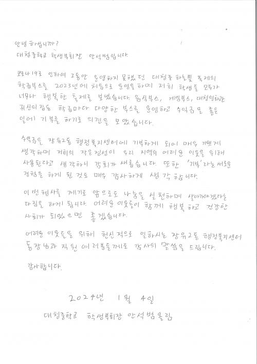 [½Åµ¿¾Æ¹æ¼Û´º½º=±èÁÖ¿¬±âÀÚ] ±èÇØ½Ã ÀåÀ¯2µ¿ÇàÁ¤º¹Áö¼¾ÅÍ¿¡¼­´Â Áö³­ 4ÀÏ ±èÇØ´ëûÁßÇб³(±³Àå ÀÌ¿¬»ï)·ÎºÎÅÍ ¾î·Á¿î ÀÌ¿ôµé¿¡°Ô ÀüÇØ´Þ¶ó¸ç 100¸¸¿ø ¼º±ÝÀ» ±âÅ¹ÇØ ¿Ô´Ù°í ¹àÇû´Ù. À̹ø ¼º±ÝÀº ´ëûÁß¿¡¼­ ¿­¸®´Â ´ëûÇϴúûÃàÀüÀ» ÅëÇØ ¸¶·ÃÇÑ ¼öÀͱÝÀ¸·Î ¾î·Á¡¦