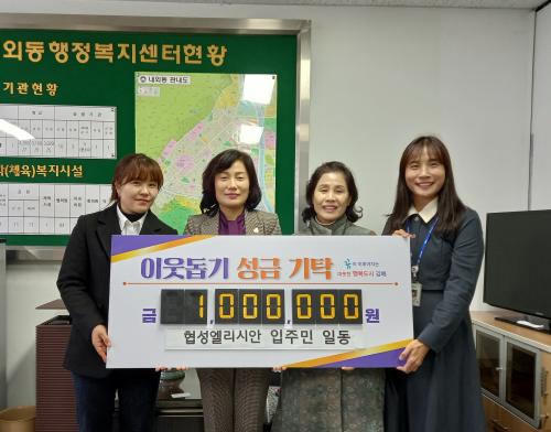 [½Åµ¿¾Æ¹æ¼Û´º½º=ÃÖ¼ÛÈ­±âÀÚ] ³»¿Üµ¿ Çù¼º¿¤¸®½Ã¾È ÀÔÁֹΠÀϵ¿(ÇкθðȸÀå ÇãÀºÁÖ)Àº Áö³­ 1¿ù 10ÀÏ(¼ö) ³»¿Üµ¿ ÇàÁ¤º¹Áö¼¾Å͸¦ ¹æ¹®ÇÏ¿© ½Ê½ÃÀÏ¹Ý ¸ð±ÝÇÑ ³ª´®¼º±Ý 100¸¸ ¿øÀ» ±âŹÇÏ¿´´Ù. À̹ø ¼º±ÝÀº Çù¼º¿¤¸®½Ã¾È Çкθðȸ¸¦ ÁÖÃàÀ¸·Î ÁֹΠ100¿© ¸íÀÌ Âü¿©ÇÏ¿©¡¦
