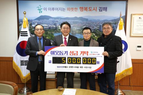 [½Åµ¿¾Æ¹æ¼Û´º½º=ÃÖ¼ÛÈ­±âÀÚ] ±èÇØ½Ã(½ÃÀå ȫſë)´Â Á¤ÀÇ·Ó°í °øÁ¤ÇÑ »çȸ¸¦ À§ÇÑ ½Ã¹Î¸ðÀÓ(ȸÀå ÇÑ»óÁø)¿¡¼­ ÀÌ¿ôµ½±â ¼º±Ý 500¸¸¿øÀ» ±âŹÇß´Ù°í 17ÀÏ ¹àÇû´Ù. ±âŹ ¼º±ÝÀº °æ³²»çȸº¹Áö°øµ¿¸ð±Ýȸ¸¦ ÅëÇØ °ü³» Àú¼ÒµæÃþ¿¡ Áö¿øµÈ´Ù. ÇÑ»óÁø ȸÀåÀº ¡°Ãß¿î °Ü¡¦