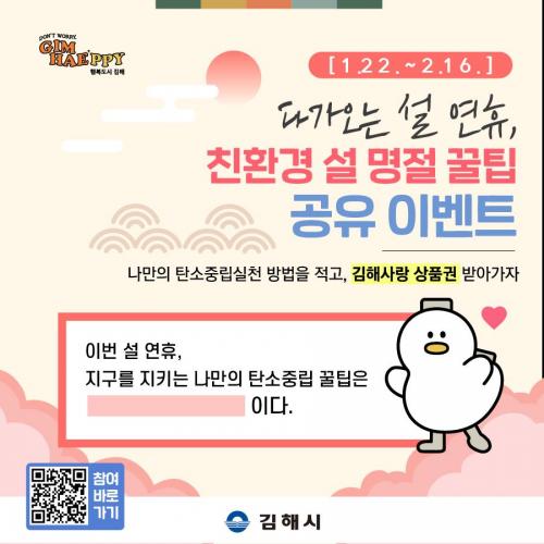 [½Åµ¿¾Æ¹æ¼Û´º½º=±èÁÖ¿¬±âÀÚ] ±èÇØ½Ã´Â ¹ÎÁ· ´ë¸íÀýÀÎ ¼³ ¿¬ÈÞ¸¦ ¸Â¾Æ ¡®Ä£È¯°æ ¼³ ¸íÀý ²ÜÆÁ °øÀ¯ ¿Â¶óÀÎ À̺¥Æ®¡¯¸¦ ÁøÇàÇÑ´Ù°í 22ÀÏ ¹àÇû´Ù. ¸íÀýÀ» ¸ÂÀÌÇÑ ½Ã¹ÎµéÀÌ ¿¬ÈÞ¿¡µµ ģȯ°æ »ýȰÀ» ½ÇõÇϰí À̸¦ °øÀ¯ÇÏ¸ç ¿Â½Ç°¡½º ÁÙÀ̱⠵¿ÂüÀ» À¯µµÇϱâ À§ÇÑ °ÍÀ¸·Î¡¦