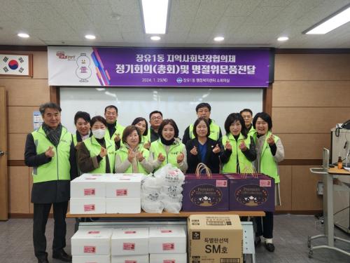 [½Åµ¿¾Æ¹æ¼Û´º½º=ÃÖ¼ÛÈ­±âÀÚ] ±èÇØ½Ã ÀåÀ¯1µ¿ Áö¿ª»çȸº¸ÀåÇùÀÇü(°øµ¿À§¿øÀå ¼­Áø¼÷, ±è¿µÇÑ)´Â Áö³­ 25ÀÏ ¼³¸íÀýÀ» ¸Â¾Æ °á¿¬¼¼´ë µ¶°Å³ëÀÎ À§¹® ¹× ¾ÈºÎ Çà»ç¸¦ ½Ç½ÃÇß´Ù. ÇùÀÇü À§¿øµéÀº µ¶°Å³ëÀÎ 20¼¼´ë¸¦ ¹æ¹®ÇØ ÀÚü ȸºñ·Î ¸¶·ÃÇÑ À§¹®Ç°(»ýÇÊǰ 20¼¼Æ®)°ú¡¦