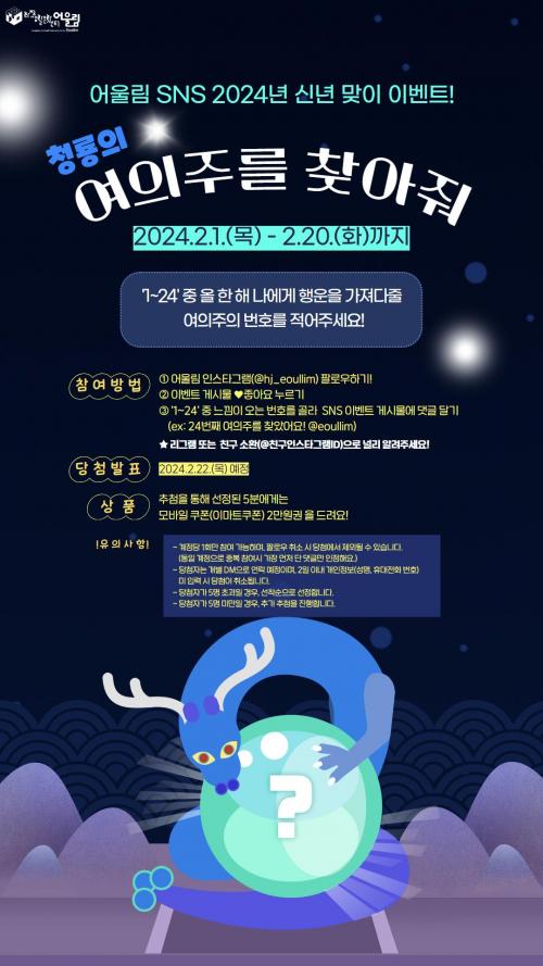 [½Åµ¿¾Æ¹æ¼Û´º½º=ÃÖ¼ÛÈ­±âÀÚ] ±èÇØ½Ã È­Á¤»ýȰ¹®È­¼¾ÅÍ ¾î¿ï¸²(ÀÌÇÏ ¾î¿ï¸²)Àº »õÇØ¸¦ ¸Â¾Æ 1~20ÀÏ ÀνºÅ¸±×·¥¿¡¼­ ½Å³â¸ÂÀÌ À̺¥Æ® ¡®Ã»·æÀÇ ¿©ÀÇÁÖ¸¦ ã¾ÆÁ࡯¸¦ ÁøÇàÇÑ´Ù°í 1ÀÏ ¹àÇû´Ù. À̺¥Æ® ³»¿ëÀº 2024³â û·æÀÇ ÇØ¸¦ ¸Â¾Æ ¼ýÀÚ ¡®1~24¡¯ Áß ÀڽŸ¸ÀÇ Çà¿îÀÇ¡¦