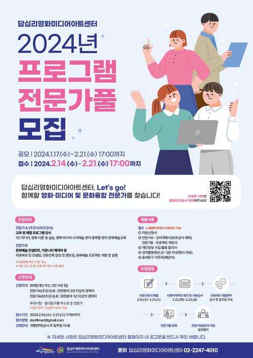 [½Åµ¿¾Æ¹æ¼Û µ¿´ë¹®=À̽ŵ¿±âÀÚ]´ä½Ê¸®¿µÈ­¹Ìµð¾î¾ÆÆ®¼¾ÅÍ(µ¿´ë¹®¹®È­Àç´Ü ÀÌ»çÀå ÀÌÇÊÇü)°¡ 2. 21.(¼ö)±îÁö 2024³â ÇÁ·Î±×·¥À» ´ã´çÇÒ Àü¹®°¡Ç®(PooL)À» ¸ðÁýÇÑ´Ù. ¸ðÁý´ë»óÀº ¿µÈ­ ․ ¹Ìµð¾î ºÐ¾ßÀÇ ±³À° ¹× üÇè ÇÁ·Î±×·¥ °­»ç(AÇü) ¹®È­¿¹¼ú ÄÁ¼³ÅÏÆ®, Ä¿¹Â¡¦
