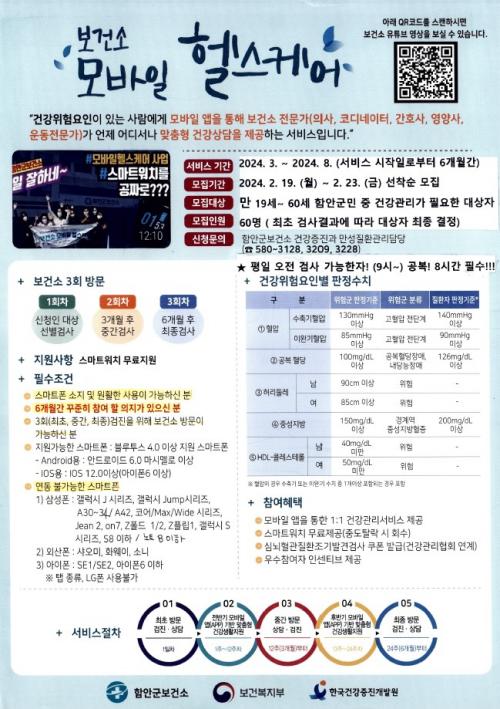 [½Åµ¿¾Æ¹æ¼Û ÇÔ¾È=À̽ŵ¿±âÀÚ]ÇԾȱºº¸°Ç¼Ò´Â ÀáÀçÀû °Ç°­À§Çè¿äÀÎÀÌ ³ôÀº ûÀå³âÃþÀ» ´ë»óÀ¸·Î ¡®2024³â ¸ð¹ÙÀÏ ÇコÄÉ¾î »ç¾÷¡¯À» ÃßÁø, ¿À´Â 2¿ù 19ÀϺÎÅÍ 2¿ù 23ÀϱîÁö Âü¿©ÀÚ 60¸íÀ» ¼±Âø¼øÀ¸·Î ¸ðÁýÇÑ´Ù. ¡®¸ð¹ÙÀÏ ÇコÄÉ¾î »ç¾÷¡¯Àº °Ç°­À§Çè¿äÀÎÀÌ ÀÖ´Â »ç¶÷¡¦
