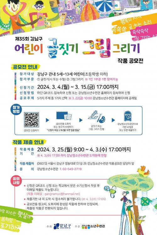 [½Åµ¿¾Æ¹æ¼Û °­³²=À̽ŵ¿±âÀÚ]°­³²±¸°¡ 5~13¼¼ÀÇ ¾î¸°À̸¦ ´ë»óÀ¸·Î ¡®Á¦35ȸ ¾î¸°ÀÌ ±ÛÁþ±â¡¤±×¸²±×¸®±â ÀÛǰ°ø¸ðÀü¡¯À» °³ÃÖÇÑ´Ù. °ø¸ðÀü¿¡ Âü°¡¸¦ ¿øÇÏ´Â ¾î¸°ÀÌ´Â 3¿ù 4ÀϺÎÅÍ 15ÀϱîÁö ¿Â¶óÀÎÀ¸·Î ½ÅûÇÏ¸é µÈ´Ù. °­³²±¸¿¡ °ÅÁÖÇϰųª °­³²±¸ ¼ÒÀç ¾î¸°ÀÌÁý¡¤À¯¡¦
