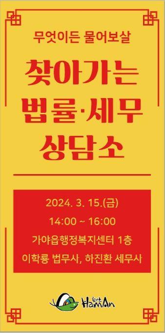 [½Åµ¿¾Æ¹æ¼Û ÇÔ¾È=À̽ŵ¿±âÀÚ]ÇԾȱºÀº ¿À´Â 15ÀÏ °¡¾ßÀ¾ÇàÁ¤º¹Áö¼¾ÅÍ¿¡¼­ ¿ÀÈÄ 2½ÃºÎÅÍ 4½Ã±îÁö ¿ÃÇØ ½Å±Ô ½ÃÃ¥ »ç¾÷ÀÎ ¡®Ã£¾Æ°¡´Â ¹ý·ü¡¤¼¼¹«»ó´ã¼Ò¡¯¸¦ ¿î¿µÇÑ´Ù°í ¹àÇû´Ù. ±º¿¡¼­´Â ¸ÅÁÖ È­¿äÀÏ ±ºÃ» ¹Î¿ø½Ç¿¡¼­ ½Ã°£Àû¡¤°æÁ¦Àû ºÎ´ãÀ̳ª »ý¾÷À¸·Î ¹ý·üÀû ¾î·Á¡¦