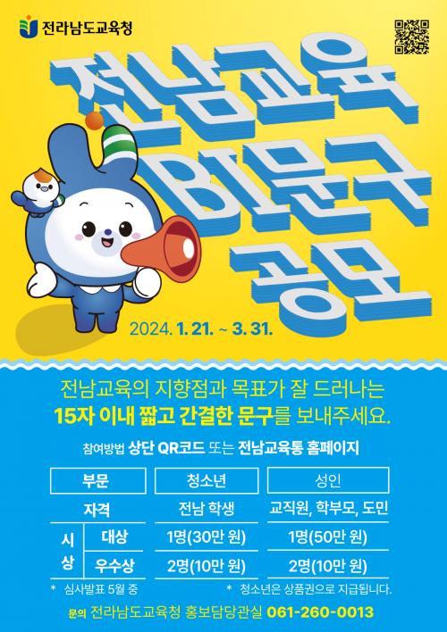 [½Åµ¿¾Æ¹æ¼Û Àü³²¿©¼ö=À̽ŵ¿±âÀÚ]Àü¶ó³²µµ±³À°Ã»ÀÌ ¿À´Â 3¿ù 31ÀϱîÁö Àü³²±³À°ÀÇ ¸ñÇ¥¿Í ÁöÇâÁ¡À» ´ãÀº ¡®BI(Brand Identity) ¹®±¸¡¯¸¦ °ø¸ðÇÑ´Ù. Àü³²±³À° ±¸¼º¿øµéÀÇ Âü¿©¸¦ ÅëÇØ Àü³²±³À°ÀÇ Á¤Ã¼¼ºÀ» È®¸³ÇÏ°í °¡Ä¡¸¦ Á¦°íÇϱâ À§ÇØ ¸¶·ÃµÈ À̹ø °ø¸ðÀüÀº û¼Ò¡¦