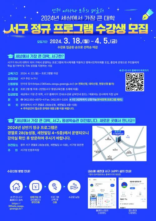 [½Åµ¿¾Æ¹æ¼Û=ÀÌÁöÇö±âÀÚ] ±¤ÁÖ±¤¿ª½Ã ¼­±¸(±¸Ã»Àå ±èÀ̰­)´Â ¡®¼¼»ó¿¡¼­ °¡Àå Å« ´ëÇÐ, ¼­±¸(ÀÌÇÏ ¼¼Å«´ë)¡¯ »ó¹Ý±â Á¤±Ô ÇÁ·Î±×·¥ ¼ö°­»ýÀ» 4¿ù 5ÀϱîÁö ¸ðÁýÇÑ´Ù. ¼¼Å«´ë´Â µµ½Ã Àüü¸¦ ÇϳªÀÇ Æò»ýÇнÀ ´ëÇÐ, ¼¼»ó¿¡¼­ °¡Àå Å« ´ëÇÐÀ¸·Î ¸¸µé¾î ÁÖ¹ÎÀÇ Áö¼Ó ¼ºÀåÀ»¡¦