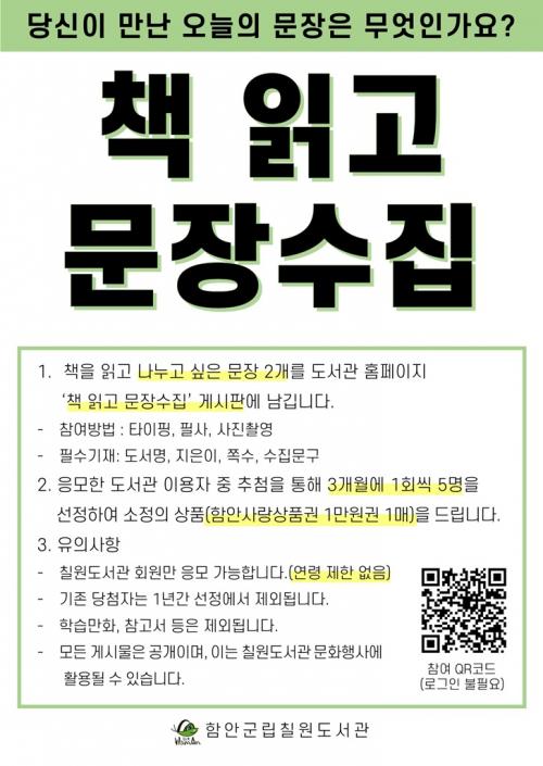 [½Åµ¿¾Æ¹æ¼Û ÇÔ¾È=À̽ŵ¿±âÀÚ]ÇԾȱº¸³ Ä¥¿øµµ¼­°üÀº µµ¼­°ü ȨÆäÀÌÁö¿¡¼­ ¿Â¶óÀÎ µ¶¼­ÇÁ·Î±×·¥ ¡®Ã¥ ÀÐ°í ¹®Àå¼öÁý¡¯À» ¿î¿µÇϰí ÀÖ´Ù. Ã¥À» ÀÐÀº ´ÙÀ½ ¸¶À½¿¡ ³²Àº ¹®ÀåÀ» 2°³ ¼±Á¤ÇØ ³ª´©´Â ÇÁ·Î±×·¥À¸·Î ÇÔ²² Àд Áñ°Å¿ò°ú ±â·ÏÇÏ´Â Áñ°Å¿òÀ» µ¿½Ã¿¡ ´À³¢°í,¡¦