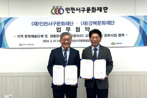 [½Åµ¿¾Æ¹æ¼Û ÀÎõ=À±¹Î½Ä±âÀÚ] (Àç)ÀÎõ¼­±¸¹®È­Àç´Ü(´ëÇ¥ÀÌ»ç ÀÌÁ¾¿ø)°ú ¼­¿ïÀÇ (Àç)°­ºÏ¹®È­Àç´Ü(´ëÇ¥ÀÌ»ç ¼­°­¼®)Àº Áö³­ 27ÀÏ ¹®È­¿¹¼ú»ç¾÷ Çù·Â ¹× Áö¿ª¿¹¼ú´Üü °£ ±³·ù¸¦ À§ÇÑ ¾÷¹« Çù·Â Çù¾à(MOU)À» ü°áÇß´Ù. ¼­±¸¹®È­Àç´ÜÀº ¿ÃÇØ ¹®È­¿¹¼ú±³À°Áö¿ø¼¾ÅÍ¿¡¡¦