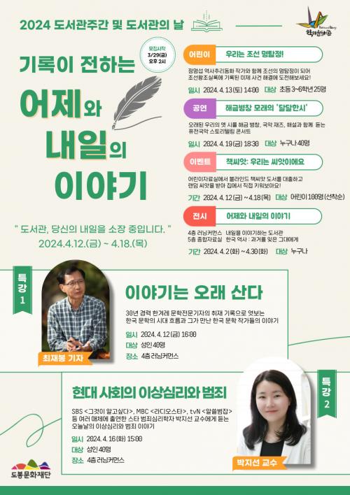 [½Åµ¿¾Æ¹æ¼Û µµºÀ±¸=À̽ŵ¿±âÀÚ]µµºÀ±¸(±¸Ã»Àå ¿À¾ð¼®) Çи¶À»µµ¼­°üÀÌ 2024³â Á¦60ȸ µµ¼­°üÁÖ°£ ¹× Á¦2ȸ µµ¼­°üÀÇ ³¯À» ¸Â¾Æ 4¿ù 30ÀϱîÁö ´Ù¾çÇÑ Çà»ç¿Í Àü½Ã¸¦ ¿¬´Ù. Çи¶À»µµ¼­°üÀº ¡®µµ¼­°ü, ´ç½ÅÀÇ ³»ÀÏÀ» ¼ÒÀå ÁßÀÔ´Ï´Ù¡¯¶ó´Â °ø½Ä Ç¥¾î¸¦ ³»¼¼¿ì°í ¡®±â·ÏÀÌ¡¦