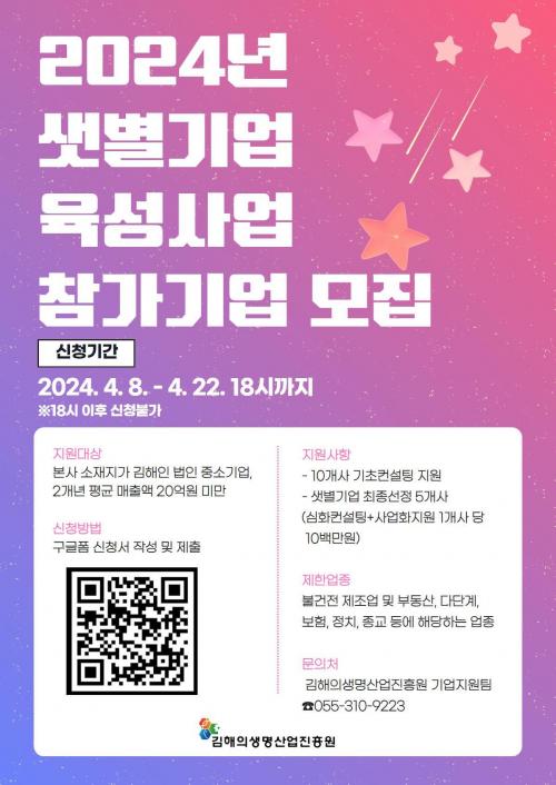 [½Åµ¿¾Æ¹æ¼Û´º½º=ÃÖ¼ÛÈ­±âÀÚ] ±èÇØÀÇ»ý¸í»ê¾÷ÁøÈï¿ø(ÀÌ»çÀå ȫſë, ÀÌÇÏ ¡®ÁøÈï¿ø)Àº ±èÇØ½Ã °ü³» ¼ÒÀç ¹ýÀÎ Áß¼Ò±â¾÷À» ´ë»óÀ¸·Î ¿À´Â 4¿ù 22ÀϱîÁö ¡®2024³â »ûº°±â¾÷(G-Rising Star) À°¼º»ç¾÷¡¯¿¡ Âü¿©ÇÒ ±â¾÷À» ¸ðÁýÇÑ´Ù°í ¹àÇû´Ù. »ûº°±â¾÷ À°¼º»ç¾÷Àº ÀúÆò°¡µÈ¡¦