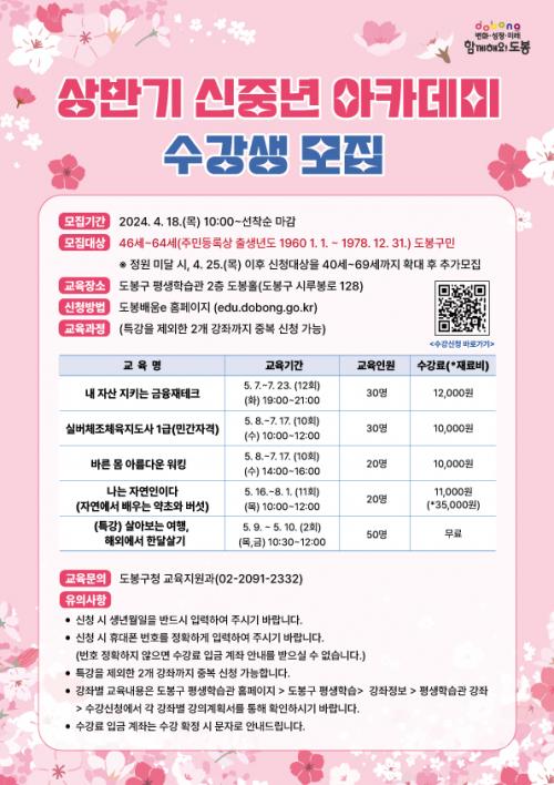 [½Åµ¿¾Æ¹æ¼Û µµºÀ±¸=À̽ŵ¿±âÀÚ]µµºÀ±¸°¡ Àλý 2¸·À» ÁغñÇÏ´Â ±¸¹ÎÀ» ´ë»óÀ¸·Î ¡®»ó¹Ý±â ½ÅÁ߳⠾ÆÄ«µ¥¹Ì¡¯¸¦ ¿î¿µÇÑ´Ù. ½ÅÁ߳⠾ÆÄ«µ¥¹Ì´Â ¼º°øÀûÀÎ ³ëÈÄ Áغñ¿Í Á¦2ÀÇ Àλý ¼³°è¸¦ Áö¿øÇÏ´Â °­Áµé·Î ±¸¼ºµÆ´Ù. ³ëÈÄ Áغñ¸¦ À§ÇÑ °­ÁºÎÅÍ »õ·Î¿î Àû¼º ¹× °ü½É»ç¸¦¡¦