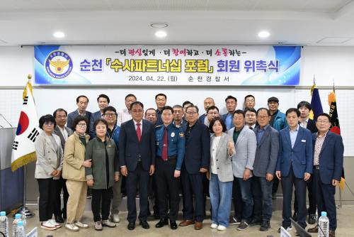[½Åµ¿¾Æ¹æ¼Û¼øÃµ=¹Ú±¤¿Á±âÀÚ] ¼øÃµ°æÂû¼­(¼­Àå ±¹½ÂÀÎ)´Â Áö³­ 4¿ù 22ÀÏ 3Ãþ ºÀÈ­¸¶·ç¿¡¼­ Áö¿ª»çÁ¤¿¡ ¹àÀº Áö¿ªÁֹΰú ¼ÒÅëÇÏ°í ¹üÁË¿¡ °øµ¿ ´ëÀÀÇϱâ À§ÇÏ¿© ¼ö»çÆÄÆ®³Ê½Ê Æ÷·³ À§Ã˽ÄÀ» °³ÃÖÇÏ¿´´Ù. À̹ø¿¡ À§ÃËµÈ È¸¿øµéÀº Ä¡¾È »ç°¢Áö´ë¿¡ ³õÀÎ ¿©¼º¡¤¾Æµ¿¡¤³ë¡¦