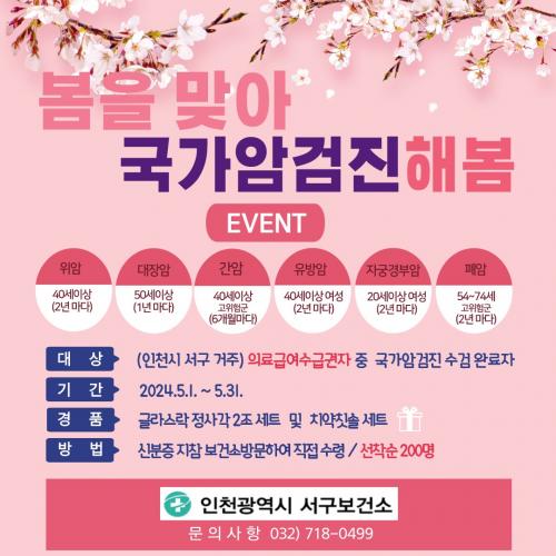 [½Åµ¿¾Æ¹æ¼Û ÀÎõ= À±¹Î½Ä±âÀÚ]ÀÎõ ¼­±¸º¸°Ç¼Ò(¼ÒÀå ÀåÁØ¿µ)´Â ÀÇ·á±Þ¿©¼ö±Þ±ÇÀÚ¸¦ ´ë»óÀ¸·Î ±¹°¡¾Ï°ËÁø ¼ö°ËÀ» µ¶·ÁÇϱâ À§ÇÏ¿© ¡º º½À» ¸Â¾Æ ±¹°¡¾Ï°ËÁø ÇØº½ ¡»À̺¥Æ®¸¦ ½Ç½ÃÇÑ´Ù°í ¹àÇû´Ù. À̹ø À̺¥Æ®´Â 5¿ù ¾È¿¡ ±¹°¡¾Ï°ËÁøÀ» ¹ÞÀº ÀÇ·á±Þ¿©¼ö±Þ±ÇÀÚ(¼­±¸ ¡¦