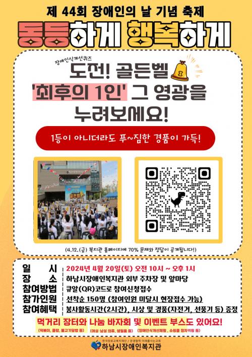[½Åµ¿¾Æ¹æ¼Û Çϳ²½Ã=À̽ŵ¿±âÀÚ]Çϳ²½ÃÀå¾ÖÀκ¹Áö°ü¿¡¼­´Â Á¦44ȸ Àå¾ÖÀÎÀÇ ³¯(4¿ù 20ÀÏ)À» ¸Â¾Æ ¡®µ¿µîÇÏ°Ô ÇູÇϰԡ¯ Çà»ç¸¦ °³ÃÖÇÑ´Ù. ¡®µ¿µîÇÏ°Ô ÇູÇϰԡ¯´Â Àå¾ÖÀÎÀÇ ³¯À» ±â³äÇØ Àå¾ÖÀΰú ºñÀå¾ÖÀÎÀÌ ÇÔ²² µ¿ÇàÇÏÀÚ´Â Àǹ̷Π±âȹµÇ¾ú´Ù. À̹ø Çà»ç´Â 4¿ù17¡¦