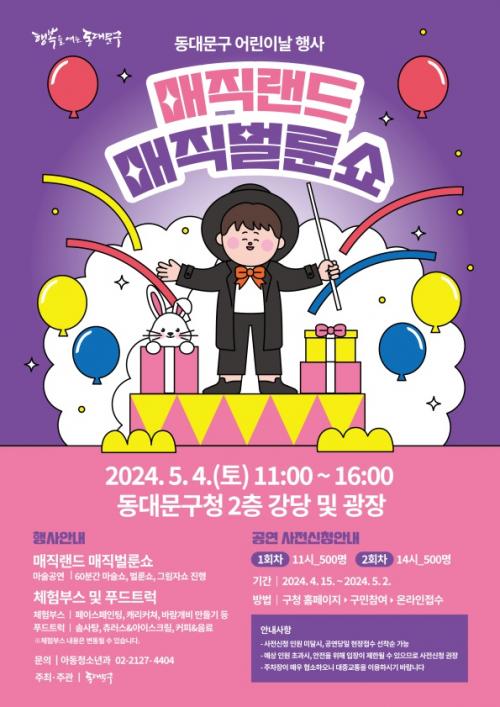 [½Åµ¿¾Æ¹æ¼Û µ¿´ë¹®±¸=À̽ŵ¿±âÀÚ]¼­¿ï µ¿´ë¹®±¸°¡ Á¦102ȸ ¾î¸°À̳¯À» ¸ÂÀÌÇÏ¿© ¿À´Â 4ÀÏ ±¸Ã» 2Ãþ ´Ù¸ñÀû°­´ç ¹× ±¤Àå¿¡¼­ ¡®¸ÅÁ÷¹ú·é¼î¡¯ Çà»ç¸¦ °³ÃÖÇÑ´Ù. À̹ø Çà»ç´Â ¸¶¼ú°ø¿¬°ú ´õºÒ¾î ´Ù¾çÇÑ Ã¼ÇèºÎ½º¿Í ǪµåÆ®·°À» ¿î¿µÇÏ¿© ¾î¸°À̵é°ú °¡Á·µéÀÌ Áñ°Ì°í Çࡦ