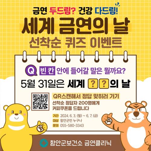 [½Åµ¿¾Æ¹æ¼Û ÇԾȱº=À̽ŵ¿±âÀÚ]ÇԾȱºº¸°Ç¼Ò¿¡¼­´Â Á¦37ȸ ¼¼°è ±Ý¿¬ÀÇ ³¯(World No Tabaco Day)À» ¸Â¾Æ, Áö¿ª¹Î°ú ÇÔ²²ÇÏ´Â ¡®±Ý¿¬ ÄûÁî À̺¥Æ®¡¯¸¦ ÁøÇàÇÑ´Ù°í ¹àÇû´Ù. À̺¥Æ®´Â 3ÀϺÎÅÍ ¿À´Â 7ÀϱîÁö ÃÑ 5ÀÏ µ¿¾È ÁøÇàµÇ¸ç ÇԾȱº¿¡ ÁÖ¼ÒÁö¸¦ µÎ°í ÀÖ´Â »ç¶÷ÀÌ¡¦