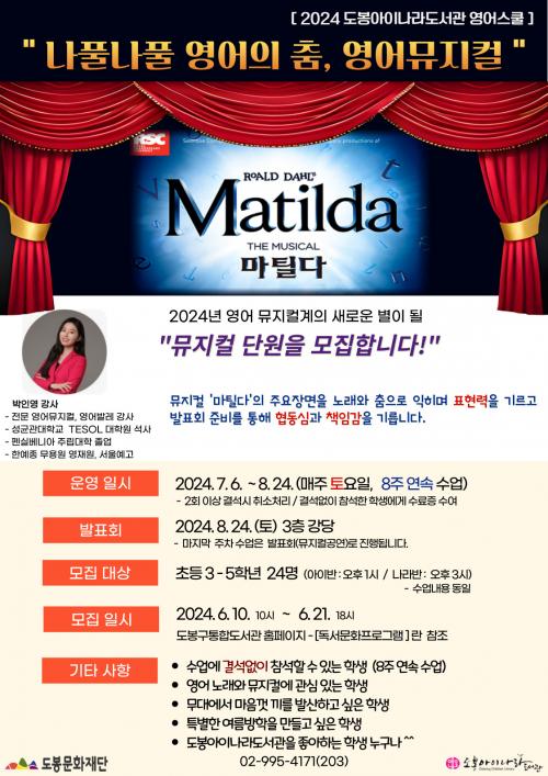 [½Åµ¿¾Æ¹æ¼Û µµºÀ±¸=À̽ŵ¿±âÀÚ]µµºÀ±¸ µµºÀ¾ÆÀ̳ª¶óµµ¼­°üÀÌ ¿©¸§¹æÇÐÀ» ¸Â¾Æ 7~8¿ù 2°³¿ù°£ ¿µ¾îƯȭÇÁ·Î±×·¥ÀÎ ¿µ¾î¹«¿ë½ºÄðÀ» ¿î¿µÇÑ´Ù. À̹ø ¿µ¾î¹«¿ë½ºÄðÀº Àü¹® ¿µ¾î¹ÂÁöÄà °­»ç¿Í ÇÔ²² ¾î¸°ÀÌ ¹ÂÁöÄà ¡®¸¶Æ¿´Ù(Matilda)¡¯ÀÇ ÁÖ¿ä Àå¸é°ú ³ë·¡¸¦ ¿µ¾î·Î ÀÍÈ÷¡¦