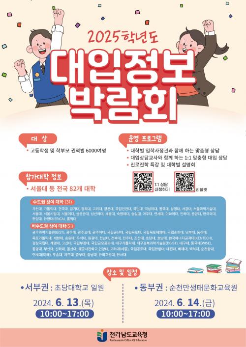 [½Åµ¿¾Æ¹æ¼Û Àü³²¿©¼ö=À̽ŵ¿±âÀÚ]Àü¶ó³²µµ±³À°Ã»ÀÌ ¿À´Â 13ÀÏ(¼ö) ÃÊ´ç´ëÇб³, 14ÀÏ(±Ý) Àü¶ó³²µµ±³À°Ã»¼øÃµ¸¸»ýŹ®È­±³À°¿ø¿¡¼­ 2025Çг⵵ ´ëÀÔÁ¤º¸ ¹Ú¶÷ȸ¸¦ °³ÃÖÇÑ´Ù. À̹ø ¹Ú¶÷ȸ´Â ÀÇ´ë Á¤¿ø È®´ë¿Í ¹«Àü°ø ¼±¹ß µî º¯¼ö°¡ ¸¹¾ÆÁø 2025Çг⵵ ´ëÇÐ ÀԽÿ¡ ¡¦