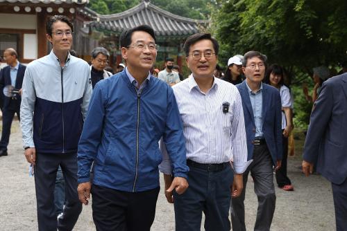 [½Åµ¿¾Æ¹æ¼Û°­Áø=¹Ú±¤¿Á±âÀÚ] °­Áø¿ø °­Áø±º¼ö¿Í ±èµ¿¿¬ °æ±âÁö»ç°¡ 10ÀÏ ¿ÀÀü °­Áø±º µµ¾Ï¸é ¸¸´ö»ê ÀÚ¶ô ¹é·Ã»ç¿¡¼­ ´Ù»êÃÊ´çÀ¸·Î ³Ñ¾î°¡´Â ¡®»ç»öÀÇ ±æ¡¯À» ÇÔ²² °ÉÀ¸¸ç »ó»ýÇÁ·ÎÁ§Æ® °¡µ¿ µî ±³·ù¿Í Çù·ÂÀÇ ±âȸ¸¦ È®´ëÇØ ³ª°¡ÀÚ°í ´ÙÁüÇß´Ù. °­Áø±º°ú °æ±âµµ, ¡¦