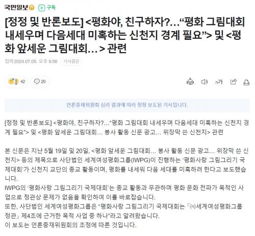 [½Åµ¿¾Æ¹æ¼Û¿©¼ö=±è±â³² ±âÀÚ] ©Å¼¼°è¿©¼ºÆòÈ­±×·ì(IWPG)ÀÌ ¾ð·ÐÁßÀçÀ§¿øÈ¸ Á¶Á¤À» ÅëÇØ <±¹¹ÎÀϺ¸>¸¦ »ó´ë·Î ¡®Á¤Á¤ ¹× ¹Ý·Ð º¸µµ¡¯¸¦ À̲ø¾î³Â´Ù. ¡®¾ð·ÐÁßÀçÀ§¿øÈ¸ Á¦5ÁßÀçºÎ(ÁßÀçºÎÀå ÃÖ¿íÁø)¡¯´Â <±¹¹ÎÀϺ¸>¿¡ IWPGÀÇ ¡®ÆòÈ­»ç¶û ±×¸²±×¸®±â ±¹Á¦´ëȸ¡¯¿Í °ü¡¦
