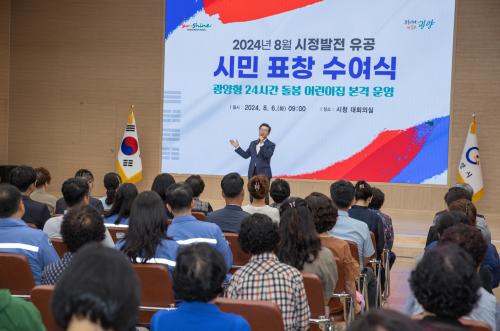 [½Åµ¿¾Æ¹æ¼Û±¤¾ç=¹Ú±¤¿Á±âÀÚ] ±¤¾ç½Ã´Â ¿À´Ã(6ÀÏ) ½Ãû ´ëȸÀǽǿ¡¼­ Áö¿ª»çȸ ¹ßÀü¿¡ °øÇåÇϰí Áö¿ª °÷°÷¿¡¼­ ²ÙÁØÇÑ ºÀ»çȰµ¿À» ÆîÃÄ ¿Â ½Ã¹Î 28¸í¿¡°Ô 8¿ù ½ÃÁ¤¹ßÀü À¯°ø ½Ã¹Î ǥâÀ» ¼ö¿©Çß´Ù. À̳¯ ¼ö¿©½Ä¿¡¼± ¾çÇö¼º ±¤¾ç¿Ü±¹Àγ뵿ÀÚ¼¾ÅÍ ¼¾ÅÍÀåÀÌ ÇàÁ¤¾ÈÀü¡¦