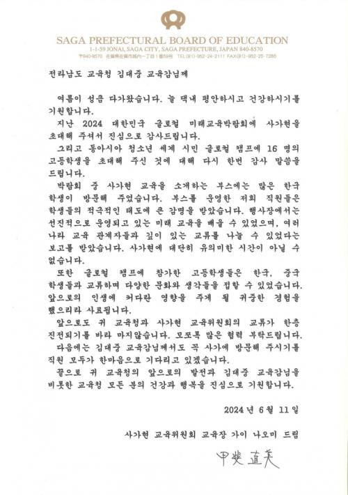 [½Åµ¿¾Æ¹æ¼Û=À̽ŵ¿±âÀÚ] Áö³­ 5¿ù ¿©¼ö¿¡¼­ ¿­¸° ¡®2024 ´ëÇѹα¹ ±Û·ÎÄà ¹Ì·¡±³À° ¹Ú¶÷ȸ¡¯¿¡ Âü¿©Çß´ø Áß±¹ »ê½Ã¼º(ߣà¤àý) ±³À°Ã»°ú ÀϺ» »ç°¡Çö(ñ¥ùÅ県) ±³À°À§¿øÈ¸°¡ ÃÖ±Ù Àü¶ó³²µµ±³À°Ã»¿¡ °¨»çÀÇ ÆíÁö¸¦ º¸³»¿Ô´Ù. Áß±¹ »ê½Ã¼º ±³À°Ã»Àº ¾ç±º(杨¡¦