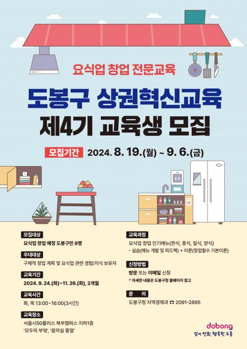 [½Åµ¿¾Æ¹æ¼Û=À̽ŵ¿±âÀÚ] µµºÀ±¸(±¸Ã»Àå ¿À¾ð¼®)°¡ ¿ä½Ä¾÷ â¾÷À» ÁغñÇÏ´Â ±¸¹ÎÀ» µ½±â À§ÇØ ³ª¼¹´Ù. ±¸´Â 8¿ù 19ÀϺÎÅÍ 9¿ù 6ÀϱîÁö ¡®µµºÀ±¸ »ó±ÇÇõ½Å±³À°¡¯ Á¦4±â ±³À°»ý 8¸íÀ» ¸ðÁýÇÑ´Ù°í ¹àÇû´Ù. ¡®µµºÀ±¸ »ó±ÇÇõ½Å±³À°¡¯Àº ½Ç½À ¹× À̷аúÁ¤À¸·Î ±¸¼ºµÈ ¿ä½Ä¾÷¡¦