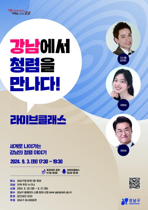 [½Åµ¿¾Æ¹æ¼Û=À̽ŵ¿±âÀÚ] ²ÞÀÌ ¸ðÀÌ´Â µµ½Ã, ¹Ì·¡¸¦ ±×¸®´Â °­³²±¸(±¸Ã»Àå Á¶¼º¸í)°¡ 9¿ù 3ÀÏ Àú³á 6½Ã ±¸Ã» 1Ãþ ·Îºñ¿¡¼­ ÃÖżº, ´Ù´Ï¿¤, ÀÌÇý¼º°ú ÇÔ²²ÇÏ´Â ¡®°­³²¿¡¼­ û·ÅÀ» ¸¸³ª´Ù¡¯ ¶óÀ̺êŬ·¡½º¸¦ °³ÃÖÇÑ´Ù. ±¸´Â ¿ÃÇØ Àü Á÷¿øÀ» ´ë»óÀ¸·Î ÇÑ ¡®Ã»·Å °ñµçº§¡¯¡¦