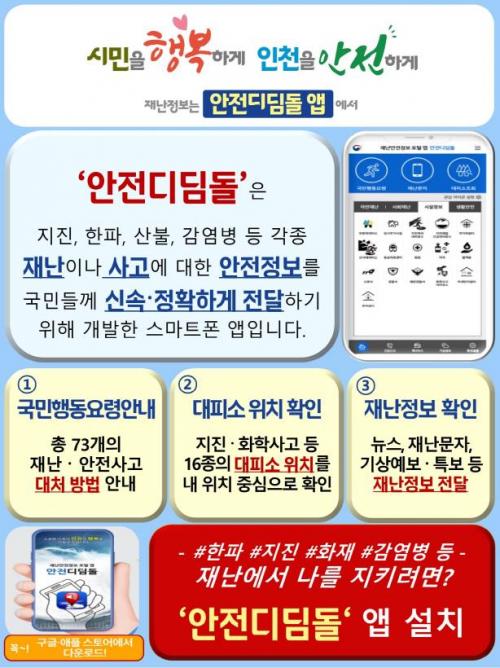 [½Åµ¿¾Æ¹æ¼Û ÀÎõ= À±¹Î½Ä±âÀÚ] ÀÎõ±¤¿ª½Ã°¡ ÃÖ±Ù ÀÚ¿¬ÀçÇØ, »çȸÀç³­ µî ¿¹ÃøÇÒ ¼ö ¾ø´Â À§±â »óȲ¿¡ ´ëÇÑ Àç³­ ´ëºñ°¡ Áß¿äÇØÁü¿¡ µû¶ó, ½Ã¹Îµé¿¡°Ô Àç³­ »óȲ¿¡ ´ëºñÇÒ ¼ö ÀÖµµ·Ï ¡®¾ÈÀüµðµõµ¹¡¯ ¾Û ÁýÁß È«º¸¿¡ ³ª¼¹´Ù. ¾ÈÀüµðµõµ¹ ¾ÛÀº Áö¿ªº° ±â»óƯº¸, ±ä±Þ¡¦