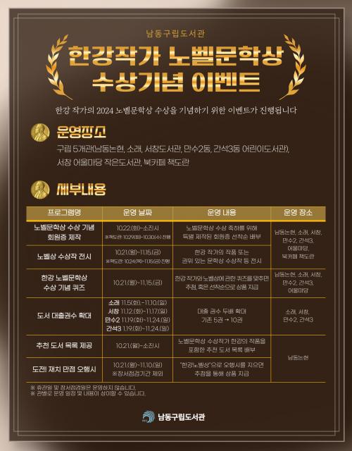 [½Åµ¿¾Æ¹æ¼Û ÀÎõ= À±¹Î½Ä±âÀÚ] ÀÎõ ³²µ¿±¸°¡ 2024 ³ëº§¹®Çлó ÇѰ­ ÀÛ°¡ÀÇ ¼ö»ó ±â³äÀ» ÃàÇÏÇϱâ À§ÇÑ Æ¯º°ÇÑ À̺¥Æ®¸¦ ÁøÇàÇÑ´Ù. ±¸´Â 10¿ù 19ÀϺÎÅÍ 11¿ù 22ÀϱîÁö ±¸¸³µµ¼­°ü 5°³¼Ò(³²µ¿³íÇö, ¼Ò·¡, ¼­Ã¢, °£¼®3¾î¸°ÀÌ, ¸¸¼ö2¾î¸°ÀÌ), ¼­Ã¢¾î¿ï¸¶´ç ÀÛÀºµµ¼­¡¦