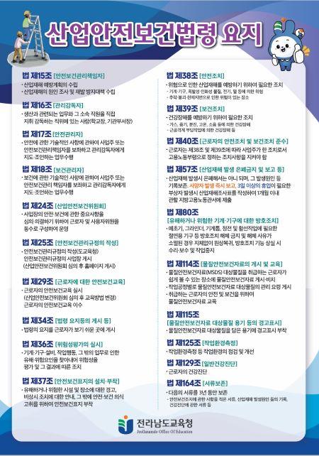 [½Åµ¿¾Æ¹æ¼Û Àü³²=À̽ŵ¿±âÀÚ] Àü¶ó³²µµ±³À°Ã»Àº µµ³» Çб³(±â°ü)ÀÇ »ê¾÷¾ÈÀüº¸°Ç¹ý·É Àǹ«ÀÌÇà »çÇ× Áؼö ¹× »ê¾÷ÀçÇØ ¿¹¹æÀ» À§ÇØ ¡®»ê¾÷¾ÈÀüº¸°Ç¹ý·É ¿äÁö¡¯¿Í ¡®¾ÈÀü¼öÄ¢¡¯Æ÷½ºÅ͸¦ Á¦ÀÛÇØ ¹èºÎÇß´Ù. »ê¾÷¾ÈÀüº¸°Ç¹ý·É ¿äÁö´Â »ê¾÷¾ÈÀüº¸°Ç¹ý·É¿¡ µû¶ó Çб³(±â°ü¡¦