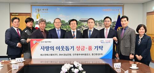 [½Åµ¿¾Æ¹æ¼Û °æ³²ÁøÁÖ=³²±Ã¿µ±â±âÀÚ] ÁøÁֽú¹ÁöÀç´ÜÀº Áö³­ 2ÀÏ ÁøÁÖ½Ãû ±â¾÷ÀÎÀÇ ¹æ¿¡¼­ Áö¿ª»çȸ ±â¾÷¡¤±â°ü ¹× ´ÜüµéÀÇ ¾î·Á¿î ÀÌ¿ôµ½±â ¼º±Ý¡¤Ç° ±âʽÄÀ» °¡Á³´Ù. À̹ø ±âŹ½Ä¿¡¼­ ¿¡½º¾Ø¿¡½º¹ëºê(ÁÖ)¿¡¼­ ¼º±Ý 5000¸¸ ¿ø, BNK°æ³²ÀºÇà¿¡¼­ ¼ºÇ°(±èÀå±èÄ¡ 65¡¦