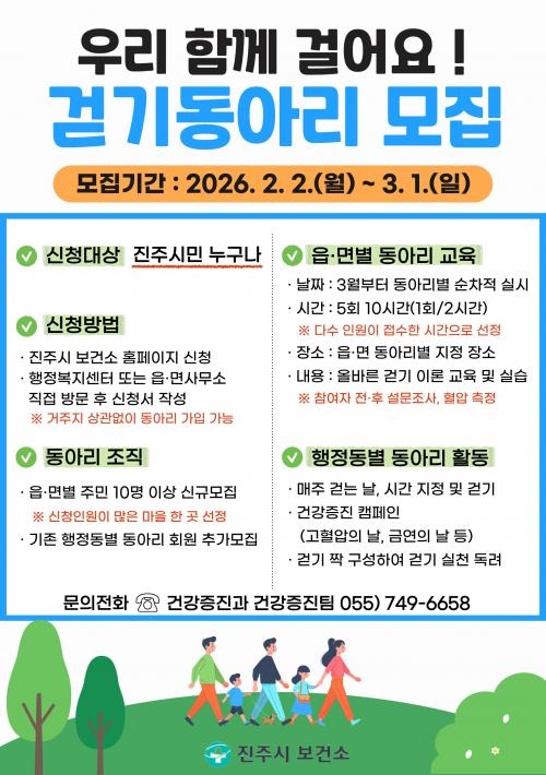 [½Åµ¿¾Æ¹æ¼Û °æ³²ÁøÁÖ=³²±Ã¿µ±â±âÀÚ] ÁøÁֽú¸°Ç¼Ò´Â ½Ã¹ÎµéÀÌ Àϻ󿡼­ ½ÅüȰµ¿À» ´Ã¸®°í, °È±â ¹®È­¸¦ È®»êÇϱâ À§ÇØ °ü³» À¾¸éµ¿º°·Î °È±â µ¿¾Æ¸® ȸ¿øÀ» ¸ðÁýÇÑ´Ù. ¸ðÁý ±â°£Àº 2ÀϺÎÅÍ 3¿ù 1ÀϱîÁöÀ̸ç, ÁøÁÖ ½Ã¹ÎÀÌ¸é ´©±¸³ª Âü¿©ÇÒ ¼ö ÀÖ´Ù. ½ÅûÀº ÁøÁֽú¸¡¦