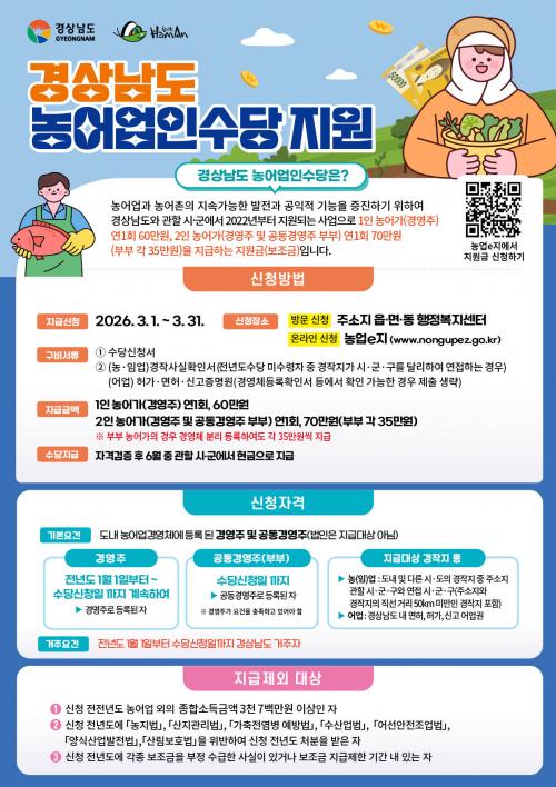 [½Åµ¿¾Æ¹æ¼Û °æ³²ÇÔ¾È=À̽ŵ¿±âÀÚ] ÇԾȱºÀº ³ó¾î¾÷ÀÇ °øÀÍÀû ±â´ÉÀ» °­È­ÇÏ°í ³ó¾îÃÌÀÇ Áö¼Ó °¡´ÉÇÑ ¹ßÀüÀ» µ½±â À§ÇØ 3¿ù 1ÀϺÎÅÍ 31ÀϱîÁö ¡®2026³â ³ó¾î¾÷Àμö´ç¡¯ ½ÅûÀ» ¹Þ´Â´Ù°í ¹àÇû´Ù. ½Åû ´ë»óÀº 2025³â 1¿ù 1ÀϺÎÅÍ °æ»ó³²µµ¿¡ Áֹεî·ÏÀ» µÎ°í ³ó¾î¾÷¡¦