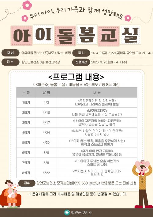 [½Åµ¿¾Æ¹æ¼Û °æ³²ÇÔ¾È=À̽ŵ¿±âÀÚ] ÇԾȱºº¸°Ç¼Ò´Â ºÎ¸ðµéÀÇ ¾çÀ° ¿ª·®À» ³ôÀÌ°í ¾ÆÀÌ¿Í ÇÔ²² ¼ºÀåÇÏ´Â °¡Á¤À» ¸¸µé±â À§ÇÑ ¡®¾ÆÀÌ(¼ÕÁÖ) µ¹º½ ±³½Ç¡¯ ¼ö°­»ýÀ» ¸ðÁýÇÑ´Ù°í 30ÀÏ ¹àÇû´Ù. ¸ðÁý ´ë»óÀº ¿µÀ¯¾Æ±â ¾Æµ¿À» µ¹º¸´Â ÇԾȱº °ÅÁÖ ºÎ¸ð ¹× Á¶ºÎ¸ð 15¸íÀ¸·Î, ¡¦