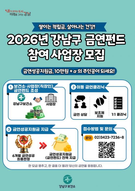 [½Åµ¿¾Æ¹æ¼Û °­³²±¸=À̽ŵ¿±âÀÚ] ²ÞÀÌ ¸ðÀÌ´Â µµ½Ã, ¹Ì·¡¸¦ ±×¸®´Â °­³²±¸°¡ Á÷ÀåÀÎÀÇ ÀÚ¹ßÀûÀÎ ±Ý¿¬ ½ÇõÀ» À¯µµÇÏ°í °£Á¢Èí¿¬ ÇÇÇØ¸¦ ÁÙÀ̱â À§ÇØ ¡®2026³â »ç¾÷Àå ±Ý¿¬ÆÝµå¡¯ Âü¿©±â¾÷À» ¸ðÁýÇÑ´Ù. º¸°Ç¼Ò¿Í »ç¾÷Àå, Á÷ÀåÀÎÀÌ ÇÔ²² ±Ý¿¬ÆÝµå¸¦ Á¶¼ºÇϰí, 6°³¿ù ±Ý¿¬¿¡¡¦