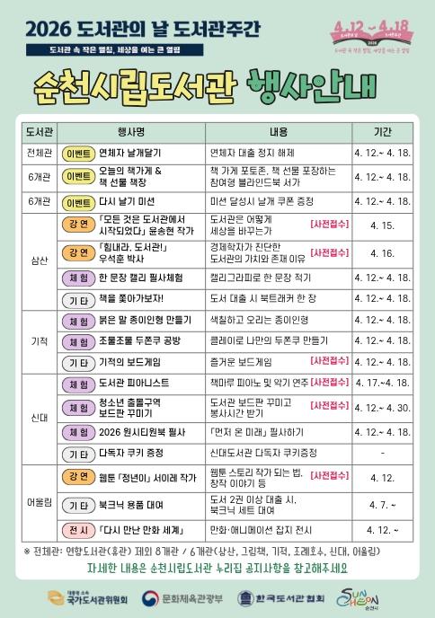 [½Åµ¿¾Æ¹æ¼Û ¼øÃµ=±è¿ëÈÆ ±âÀÚ] ¼øÃµ½Ã´Â ¿À´Â 12ÀϺÎÅÍ 18ÀϱîÁö ¡®µµ¼­°üÀÇ ³¯¡¯ ¹× ¡®µµ¼­°ü ÁÖ°£¡¯À» ¸Â¾Æ ¼øÃµ½Ã 8°³ µµ¼­°ü¿¡¼­ °­¿¬, üÇè, Àü½Ã µî µ¶¼­¹®È­Çà»ç¸¦ ¿î¿µÇÑ´Ù°í ¹àÇû´Ù. À̹ø µµ¼­°üÁÖ°£Àº ¡®µµ¼­°ü ¼Ó ÀÛÀº Æîħ, ¼¼»óÀ» ¿©´Â Å« ¿­¸²¡¯À» ÁÖ¡¦